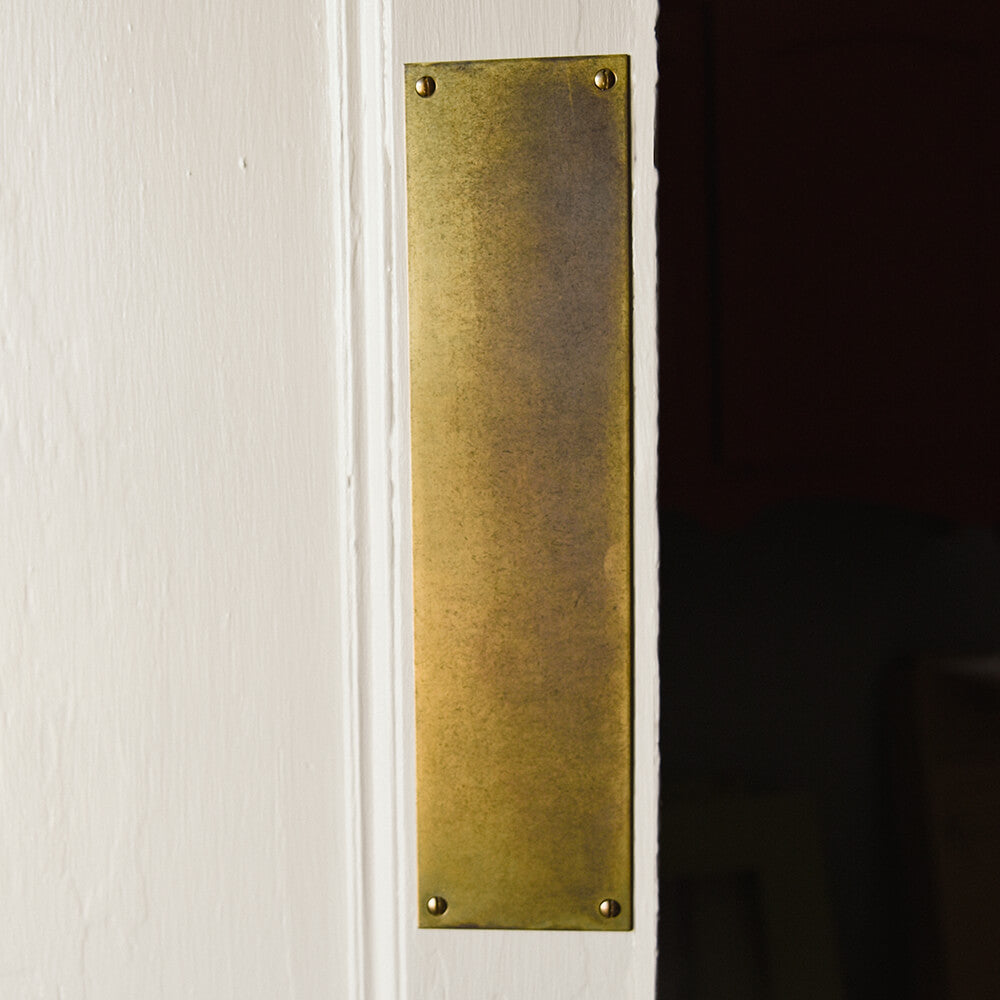 Simple door push plate made from solid brass with an aged finish. Known as a living finish, this will continue to age and develop over time. Finger plates became popular between 1850-1950 and were also known as door plates. Designed to protect the area of the door which has most contact.