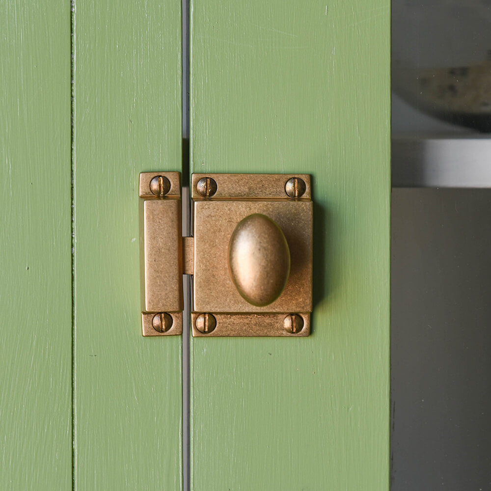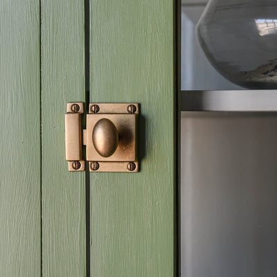Superior sprung cupboard latch that has an oval turning knob and square backplate that compliment each other beautifully. Made from solid brass that is durable and weighty. The aged brass finish is hand applied and creates lovely warm tones that will continue to age naturally over time.