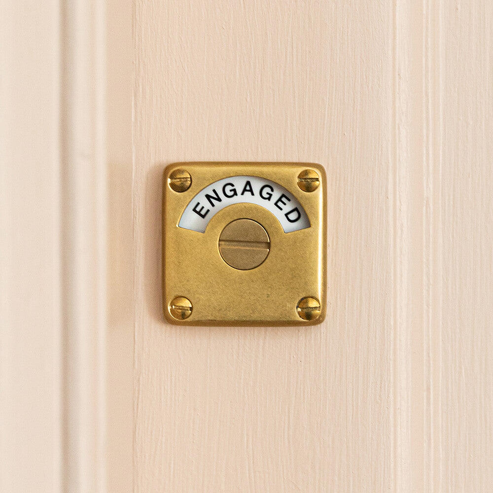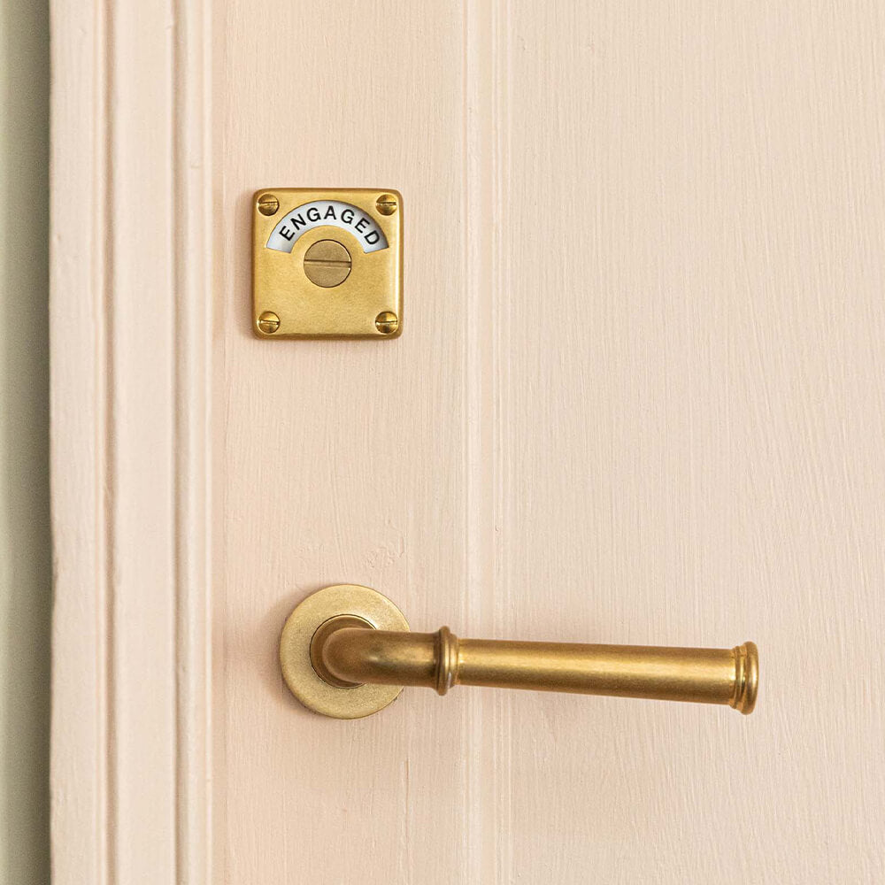 A bathroom lock with a soft aged appearance that will age and develop over time to reveal the beautiful natural hues of the brass. Hand made in the UK. High quality latch with an interior sliding bolt and indicator dial on the exterior of the door.