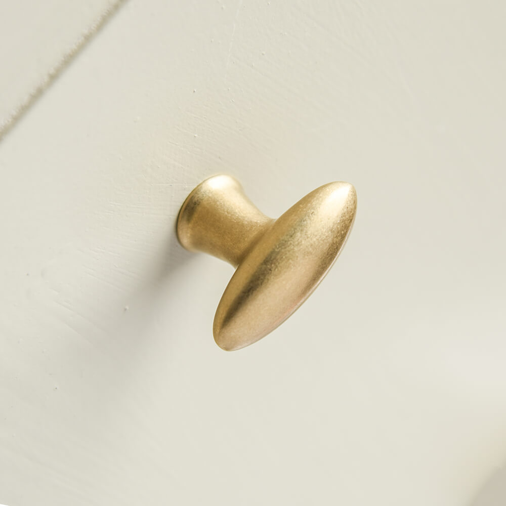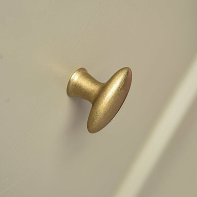 Oval cupboard knob that is hand crafted in a UK foundry from solid brass and finished in a soft ageing that is hand applied and continues to evolve over time. The elongated oval design in the zeppelin form adds a touch of elegance that would look beautiful on cupboard doors, dressers and wardrobes.