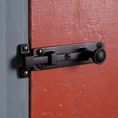 Practical door bolt that is made from solid aged bronze with an almost black finish. It can be used horizontally or vertically due to the strong spring mechanism in the bolt and as it comes with a variety of different keeps it can be used on windows, doors or cupboards.