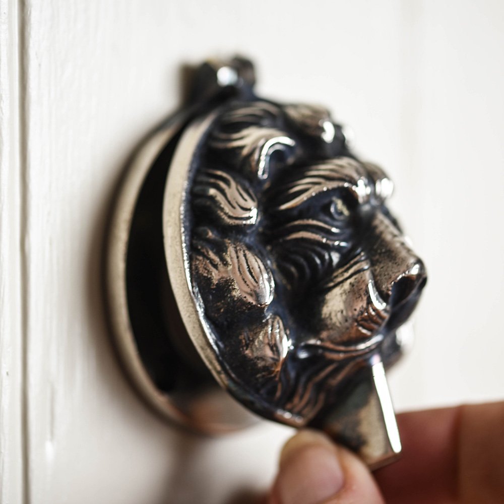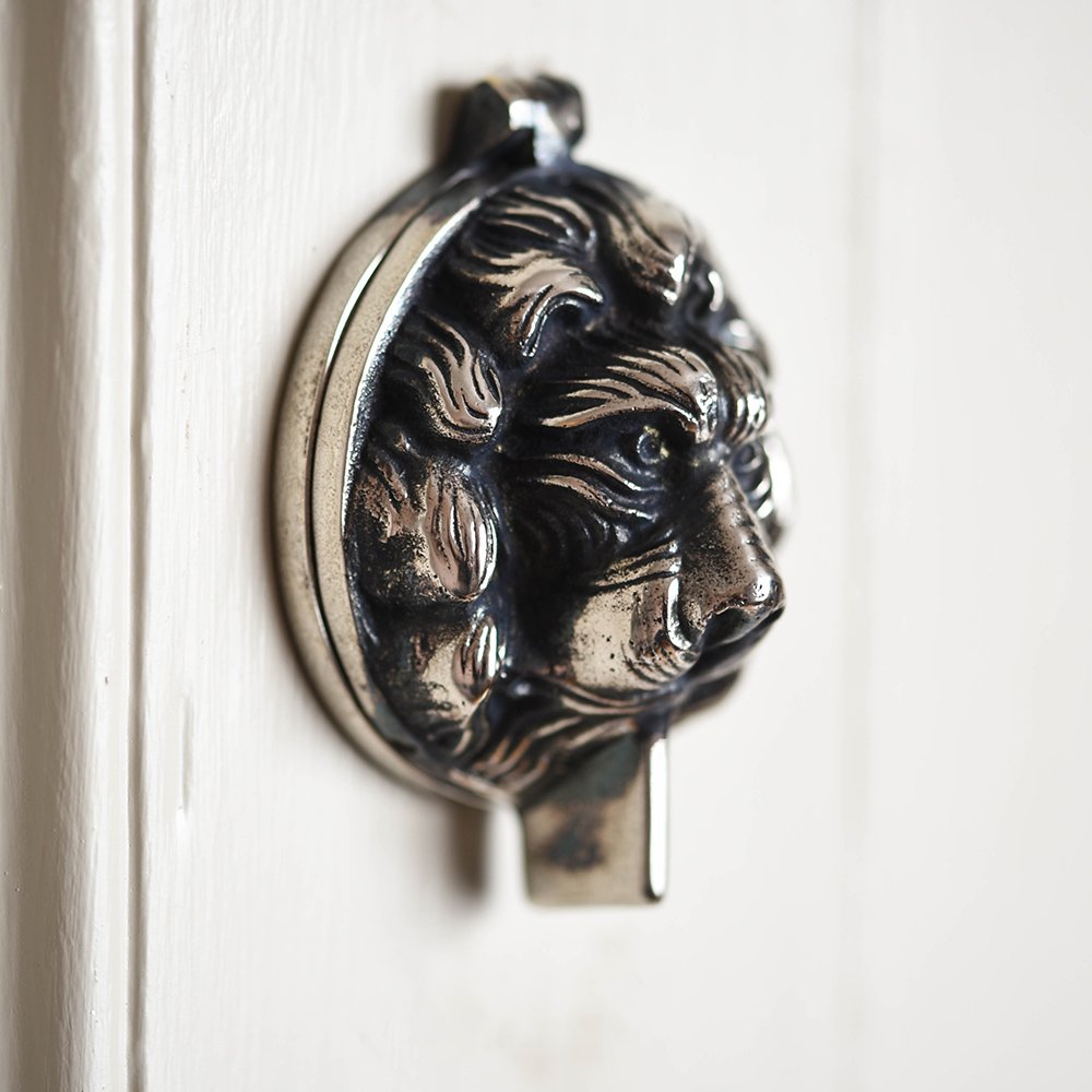 This very smart authentic replica of a latch/lock cover is made to cover circular Yale latches on your front or back door. The aged nickel plated lion head is also a knocker. The original was taken from a Edwardian guest house, this knocker was found on each guest door. Hiding each lock but also providing a way of chamber staff discreetly calling for guests.