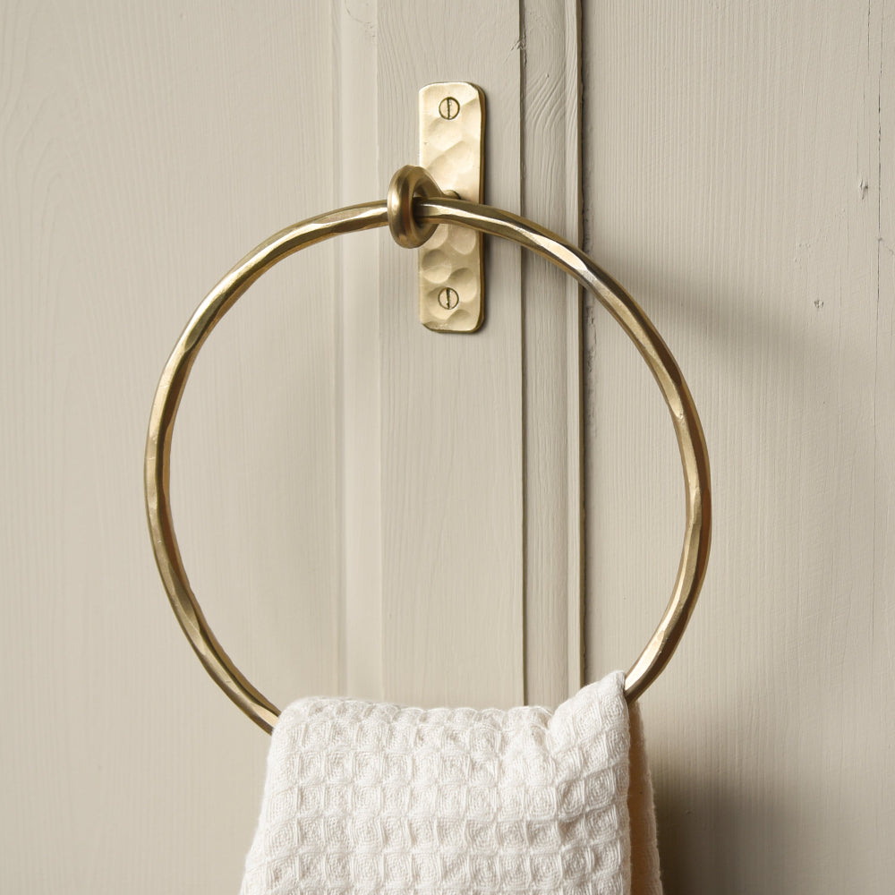 Simple hoop design towel holder made using traditional sandcasting techniques, giving each piece a unique organic patination on the surface, with an antique brass style finish applied after. Specially treated to be moisture and steam resistant, making it ideal for bathrooms.