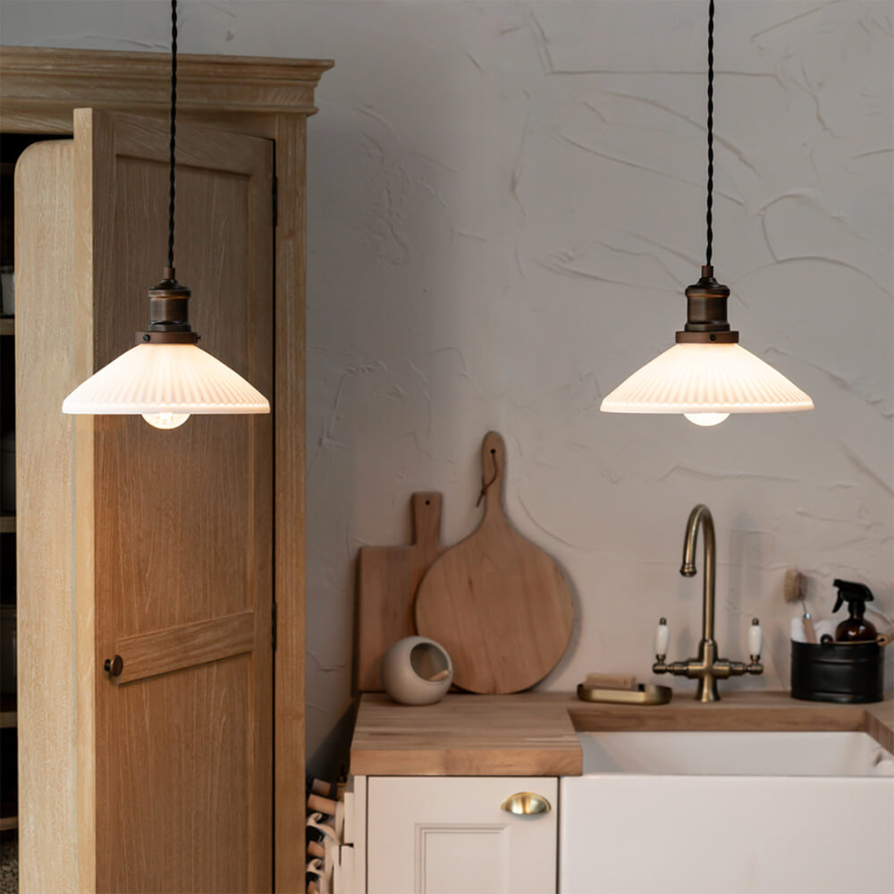 Antique-Bronze-&-Ceramic-Beaulieu-Double-Fluted-Cone-Pendant-Light-in-kitchn-scene
