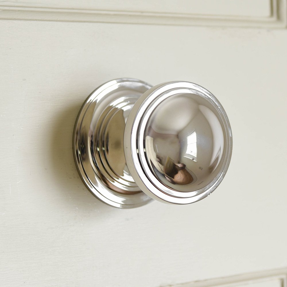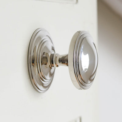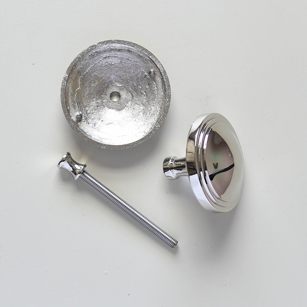 High quality large round Art Deco style door pull that would add elegance to any entrance. Made using traditional techniques from solid brass with a nickel plating and supplied with a through bolt with an attractive end cap. Designed to sit in the centre of the door to push and pull the door.