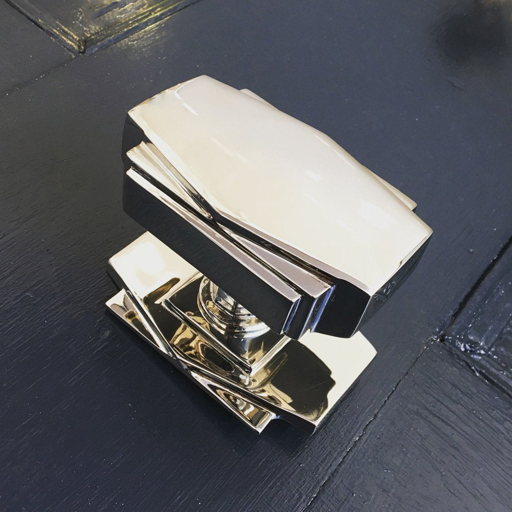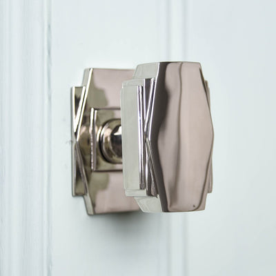 Beautiful Art Deco style door pull crafted from solid brass with a polished nickel plated finish. Great proportions and angular detailing. Door pulls are usually positioned in the centre of a front door to help push and pull the door closed.