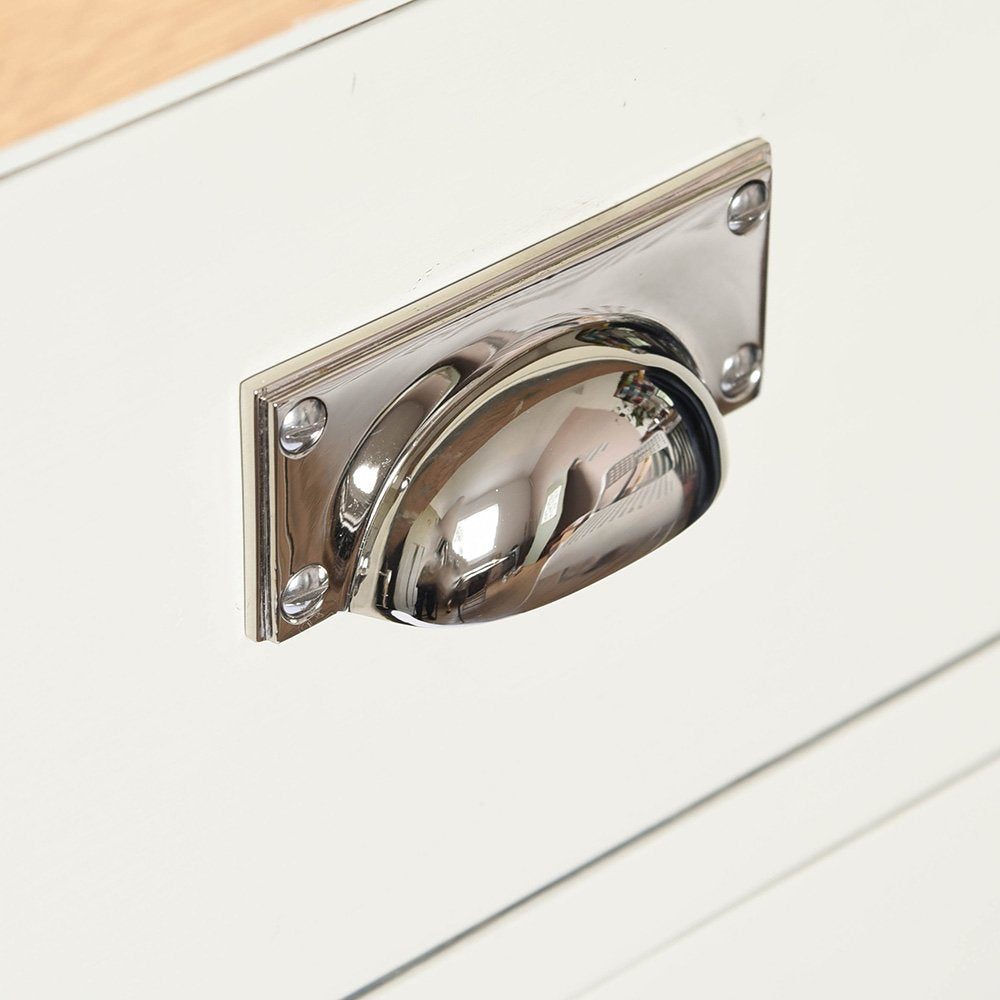 Lovely drawer handle with an Art Deco style that has been beautifully crafted from solid brass with a nickel plated finish. The ridged detail around the outer edge adds depth to a classic design. Prefect for drawers, cupboards or dressers.