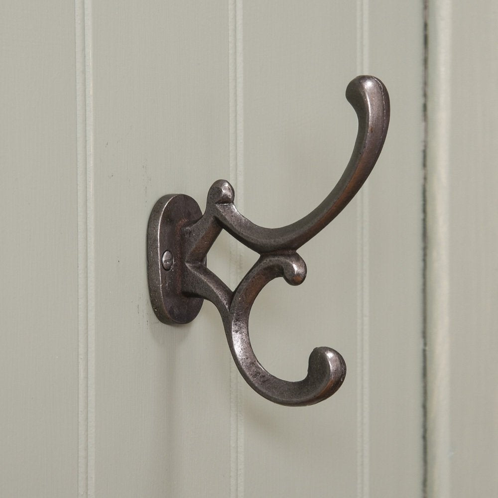 This double coat hook has beautiful sinuous lines and flowing shapes that are characteristic of the art nouveau period and design. Made from cast iron the sweeping top hook is complimented by the curl of the bottom hook adding a little flourish of decorative detail to your hallway, back of a door, porch or boot room. Available in a 4 inch or 5 inch size.
