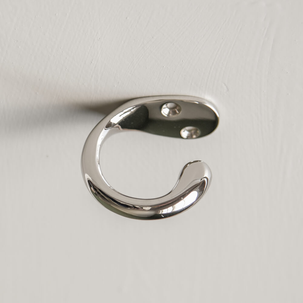 Useful bag hook that is crafted from solid brass with a polished nickel finish. This versatile hook is designed to be fixed to the underside of a table or desk for hanging a bag safely out of sight. Can also be used as a curtain tie back.