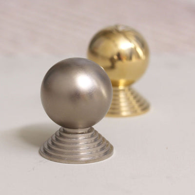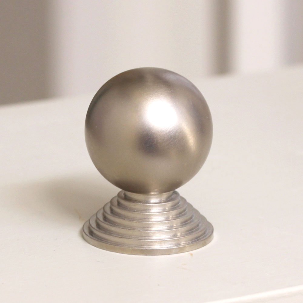 Gorgeous cupboard knob that is made from solid brass with a brushed nickel finish in an Art Deco style. It comes in two parts so the rounded ball sits on top of the stepped backplate. Hand made in the UK for long lasting quality.
