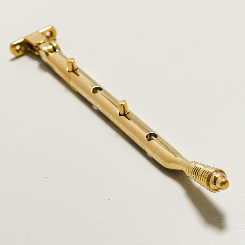 Solid brass casement window stay with a lovely reeded 'beehive' finial. Beautifully hand crafted in the UK this will add a touch of elegance to your window. The term 'Beehive' refers to the repeat reeded detailing which became highly popular in the Regency era and used heavily throughout the Victorian period and into the early 20th Century.