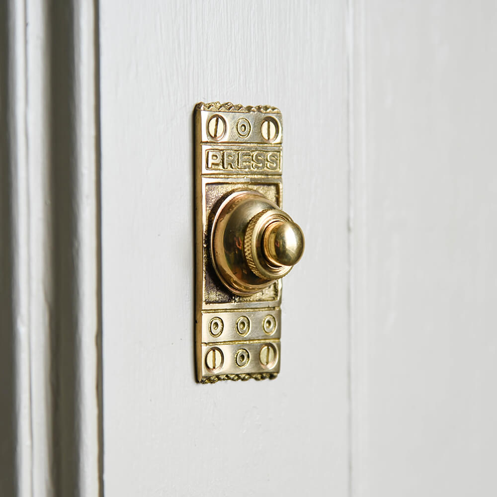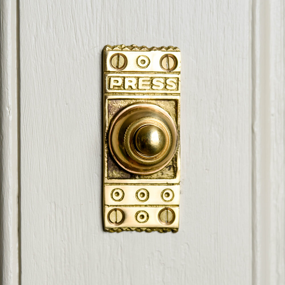 A unique bell push with circular repeating patterns reminiscent of the Aesthetic Movement. Unlacquered brass that will dull down and age authentically with time.