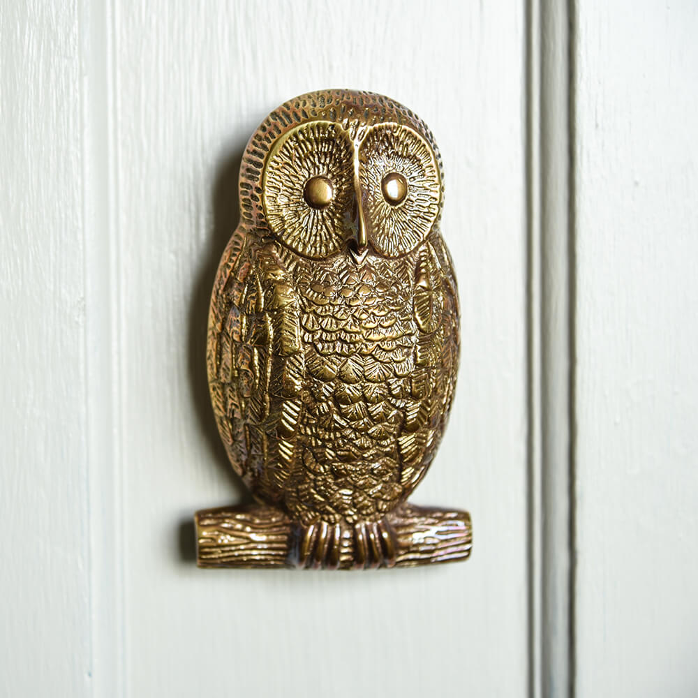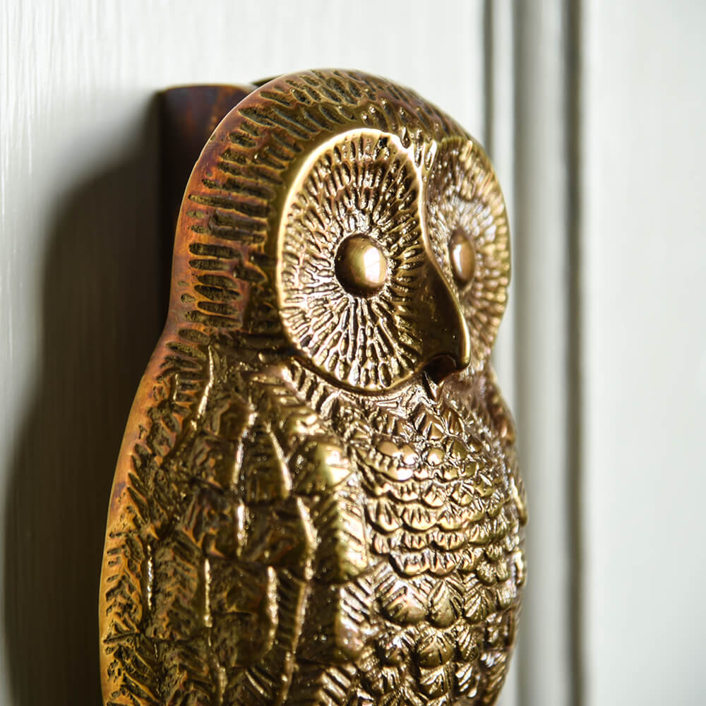 Characterful owl door knocker cast from solid brass and hand finished giving each piece individuality and detail. Striker plate and fixings all included, suitable for wood or solid core composite doors. If you are looking to complete your door with other door furniture fittings we recommend 'polished brass' or 'polished antique brass' will sit best with this product.