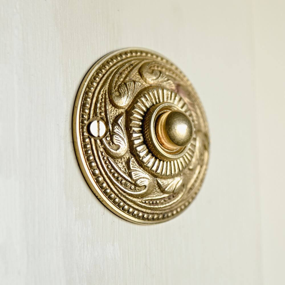 Round solid brass wired door bell with an Art Nouveau inspired design.