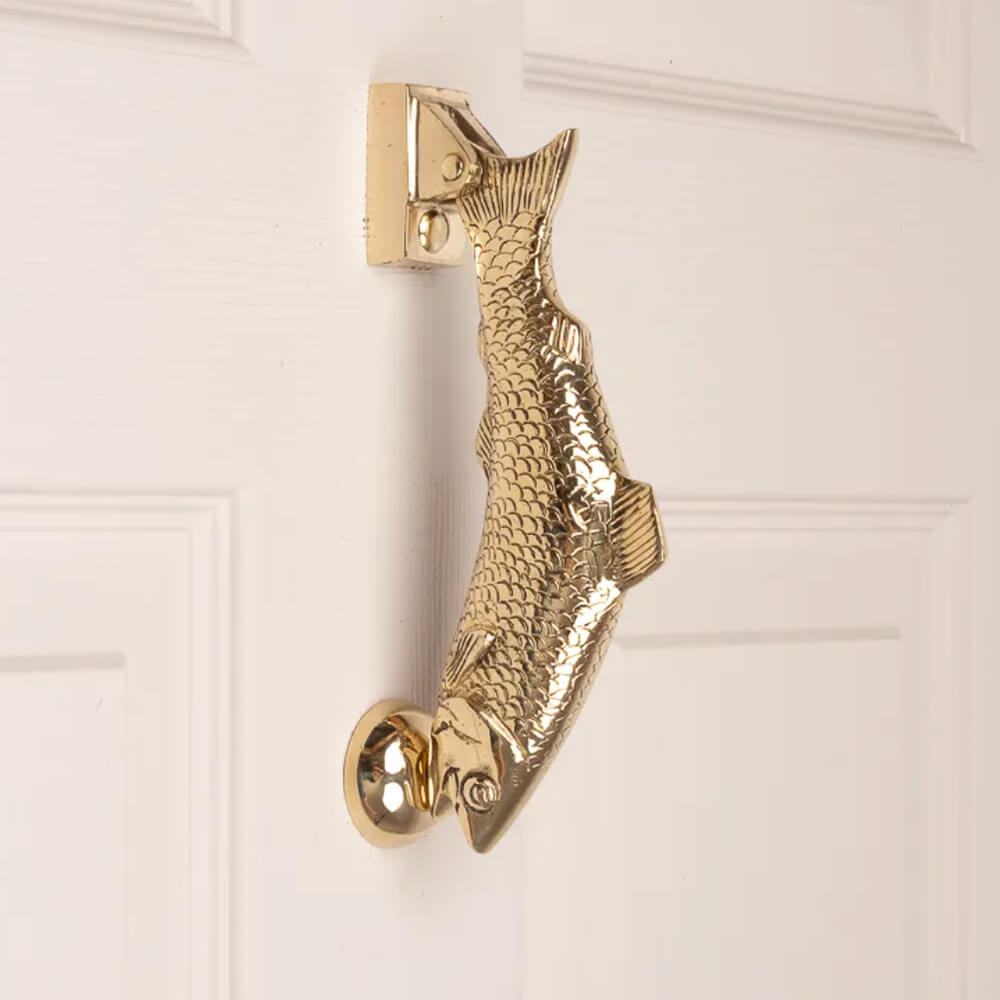 Delightful solid brass fish door knocker in an elegant salmon design. The curved body faces downwards with open mouth, and the form bears a sense of the fish jumping through water. High quality and weighty with intricate detailing throughout. Traditionally made through the process of sand casting which leaves behind pitting and indentations to the surface, adding to its charm and character.