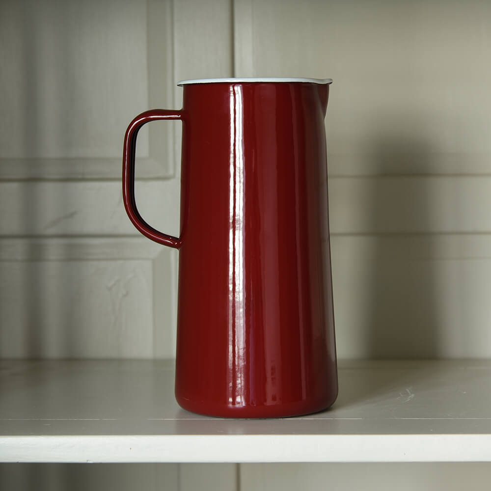 Sturdy enamel serving pitcher that can hold up to 3 pints and is finished in burgundy with a white interior. Ideal jug for serving chilled drinks at the dinner table inside or out or large enough for flowers.