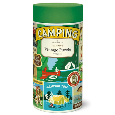 Quality 1000 piece jigsaw puzzle featuring nostalgic illustrations of camping. These puzzles come in a tube style box and a calico bag for the pieces along with a mini poster showing the image you are recreating.