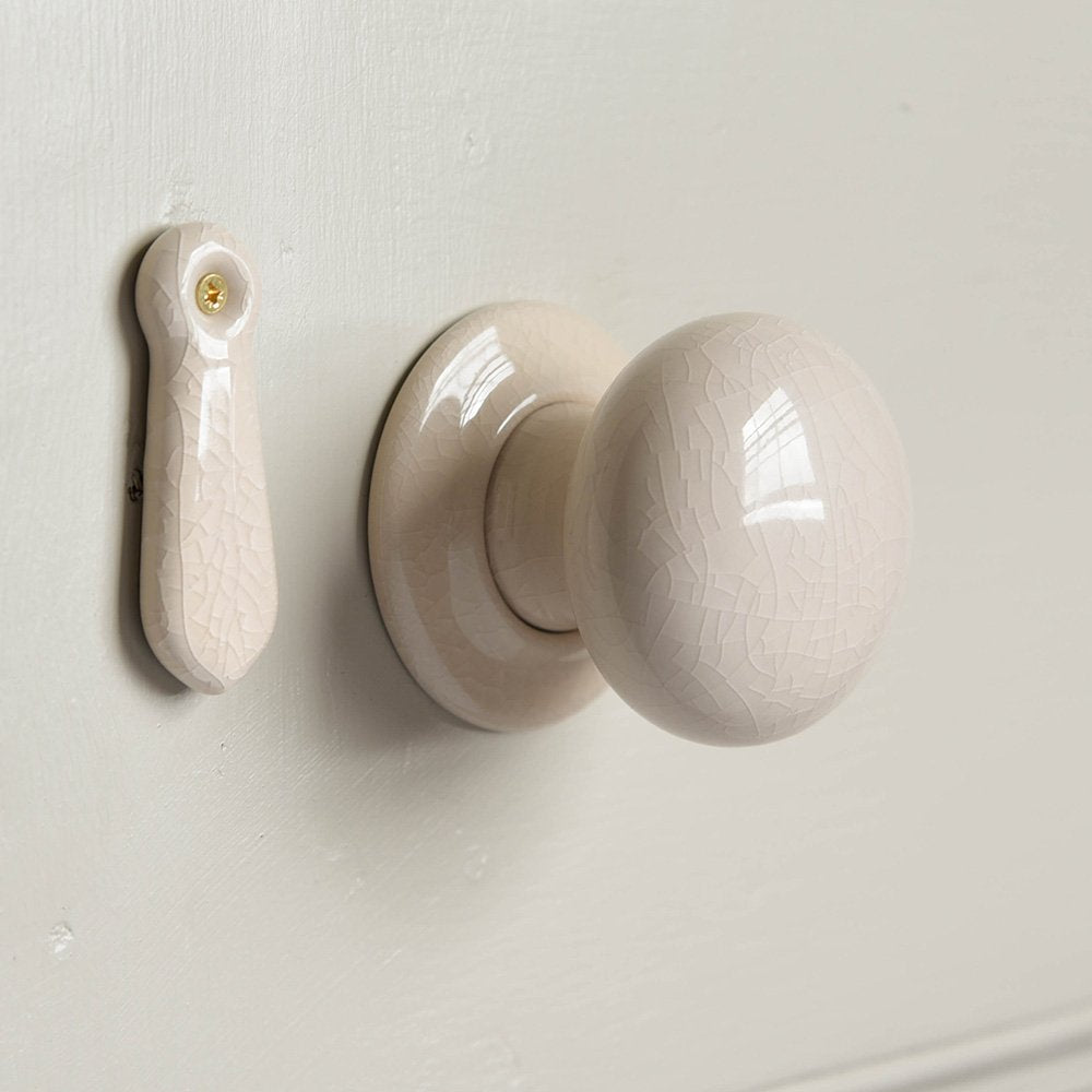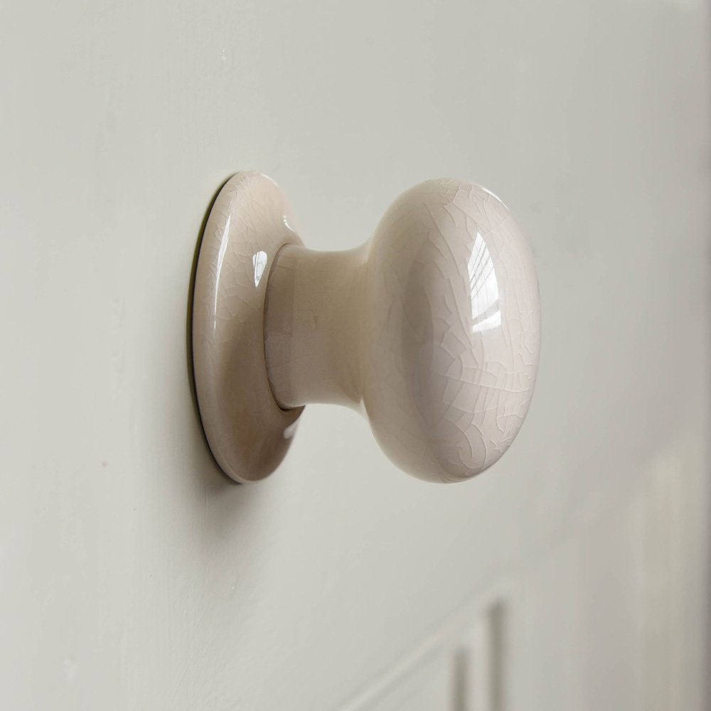 A traditional pair of cream ceramic door knobs with matching roseplates with a delicate crackle glazed finish. These ceramic handles were popular for almost a century, first appearing around 1830. This style of handle were widely used in Victorian homes upstairs, in servant quarters and in less grand properties due to being more affordable than brass. These handles are still very popular today due to their high quality, affordability and that they are still made in the UK.