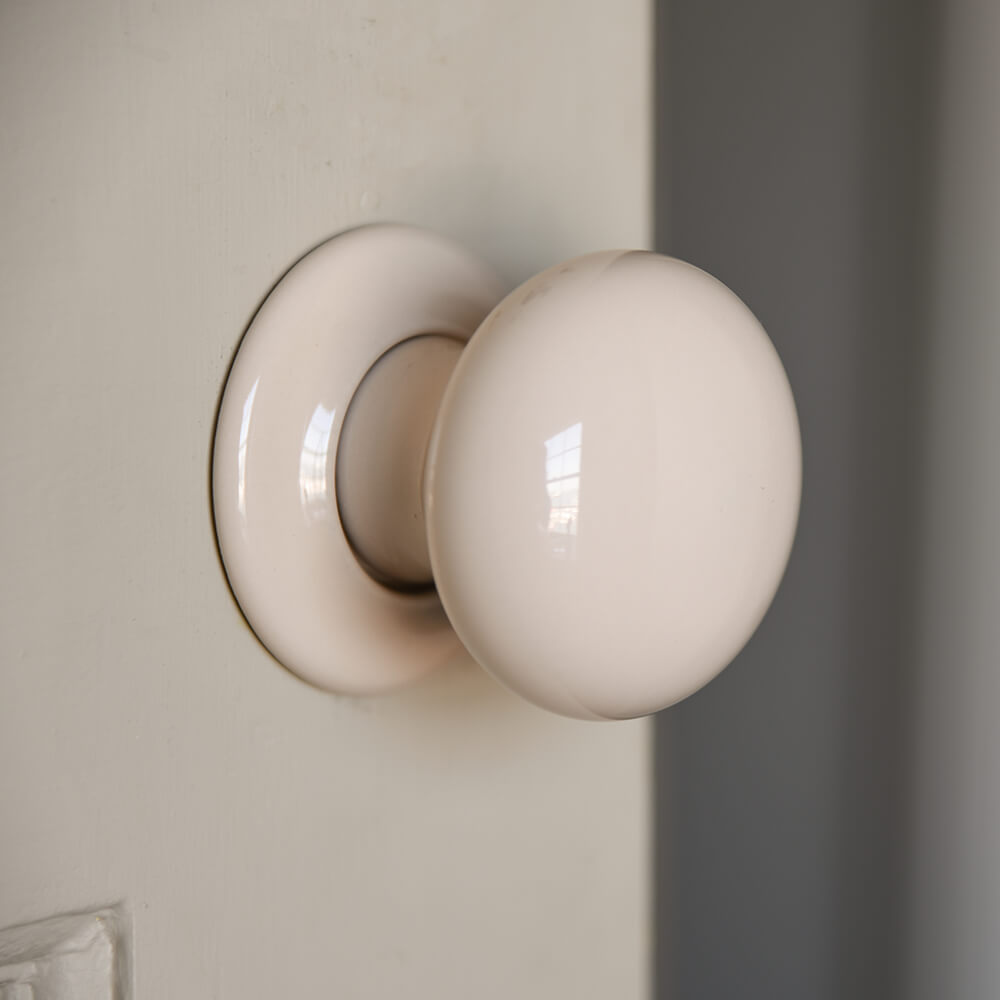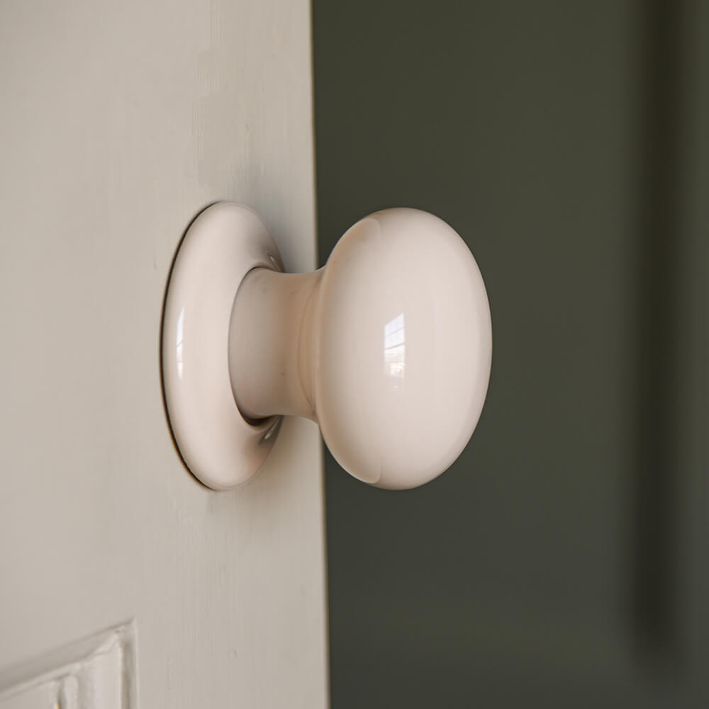 larger detail of cream ceramic door knobs on door