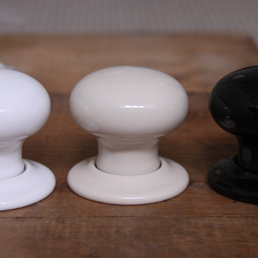 A traditional pair of cream ceramic door knobs with matching roseplates. These ceramic handles were popular for almost a century, first appearing around 1830. This style of handle were widely used in Victorian homes upstairs, in servant quarters and in less grand properties due to being more affordable than brass. These handles are still very popular today due to their high quality, affordability and that they are still made in the UK.