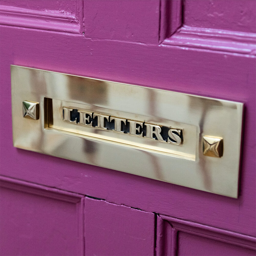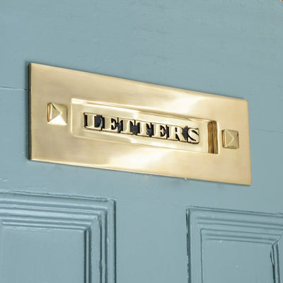 A solid brass letterplate with the word LETTERS embossed on the flap. A slightly aged finish makes this plate particularly authentic to the Victorian style and is finished off with stud detail.