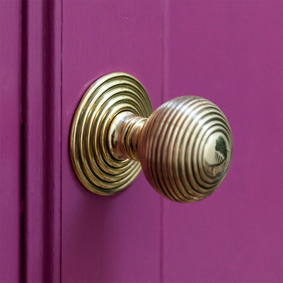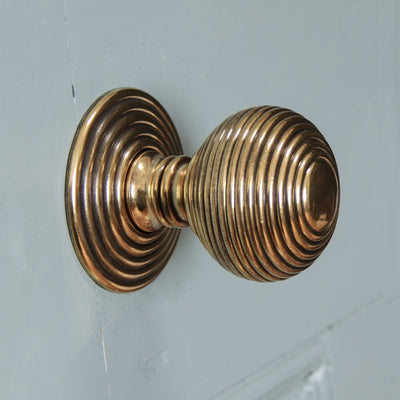 Impressive reeded beehive centre door pull made from brass with an aged appearance. This beehive design is one of our most popular door furniture styles and compliments many of our products. The beehive or reeded style became a highly popular design born in the Regency era and used heavily throughout the Victorian period and into the early 20th Century. Usually located in the centre of your door to allow you to push and pull the door open and closed.