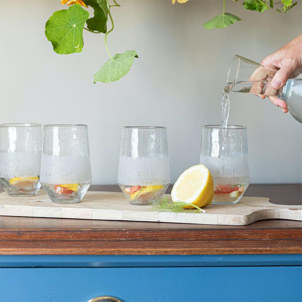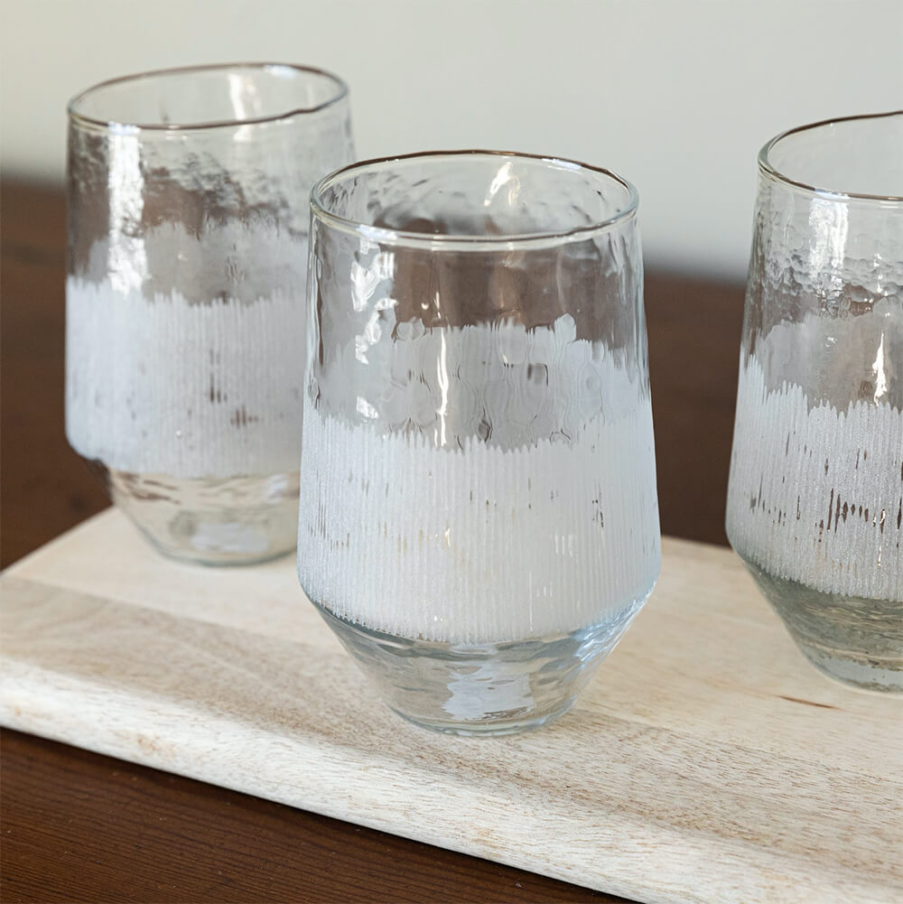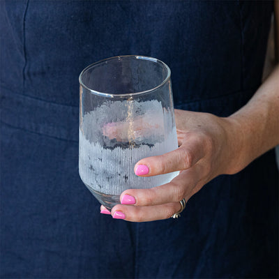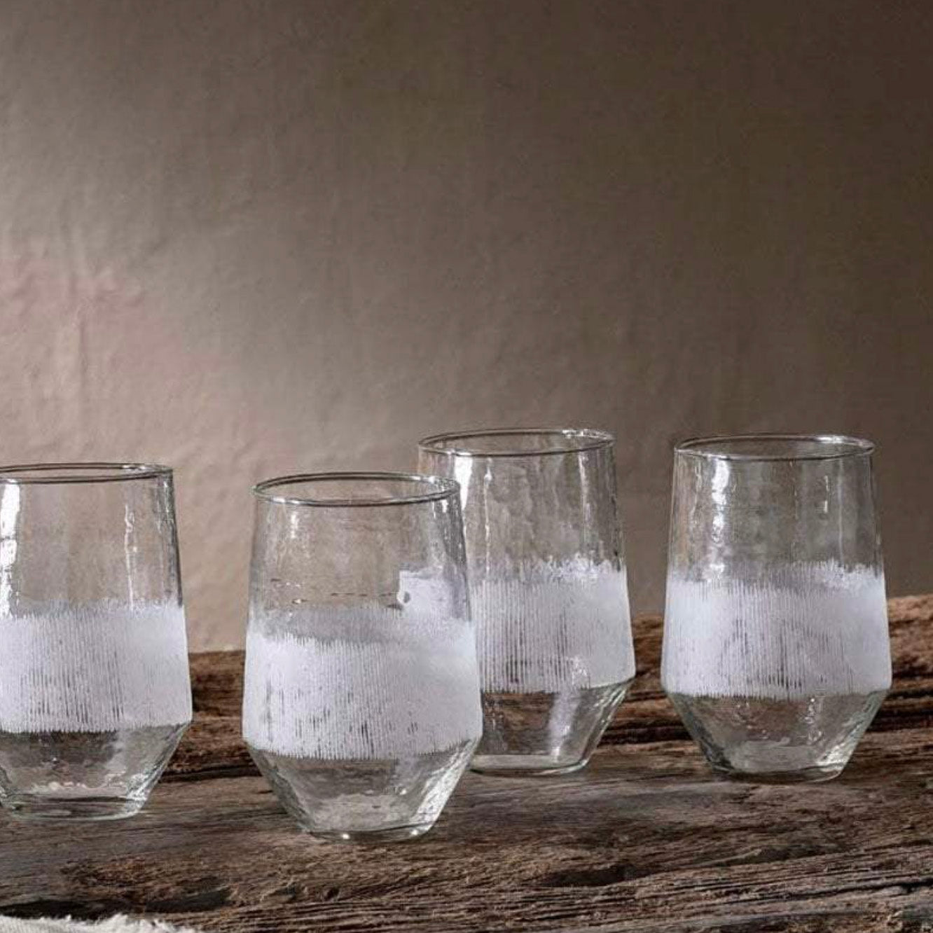 Clear recycled glass wine glasses with unique frosted etched linear detailing sold as a set of 4. Hand blown using traditional techniques. Pair with our matching Anara decanter and tumblers.