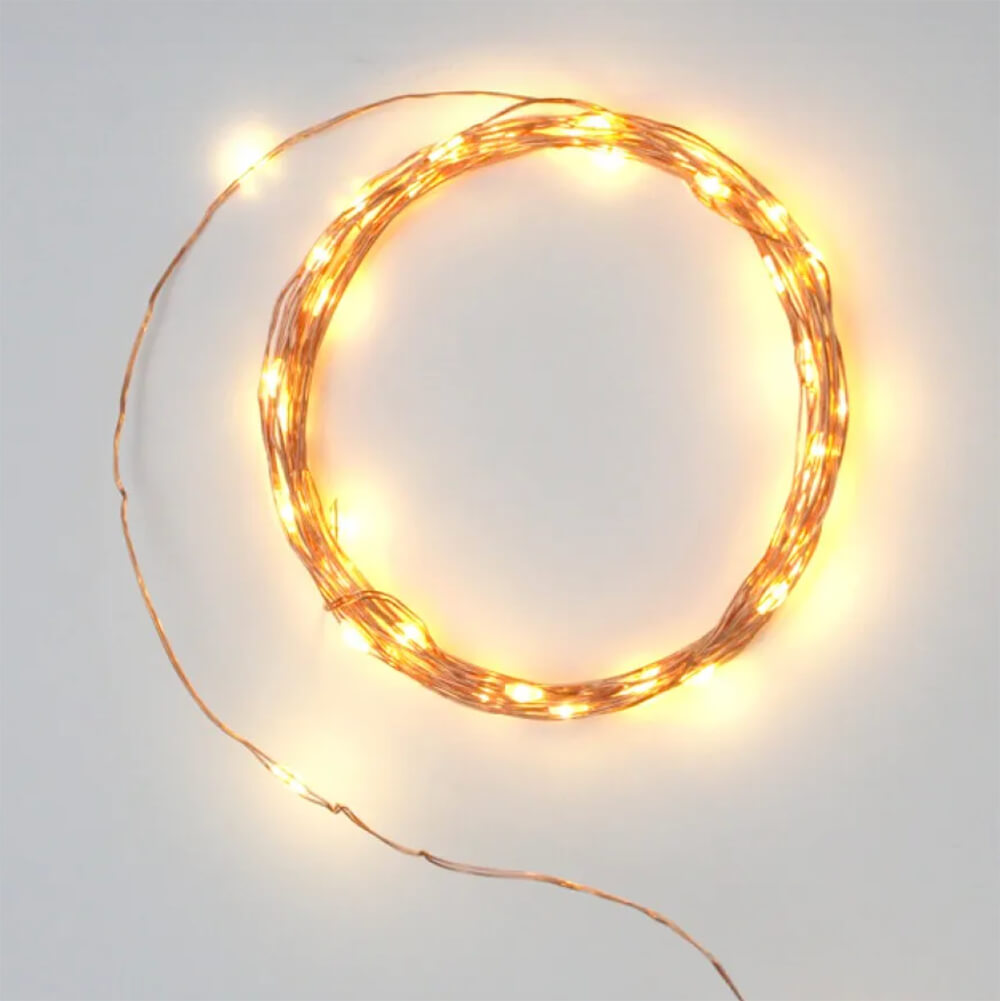 Copper wire fairy lights adorned with 40 warm white LED's. These versatile lights are battery operated so they can be hung anywhere around the home or popped in a glass vase, with a built in timer for ease of use.