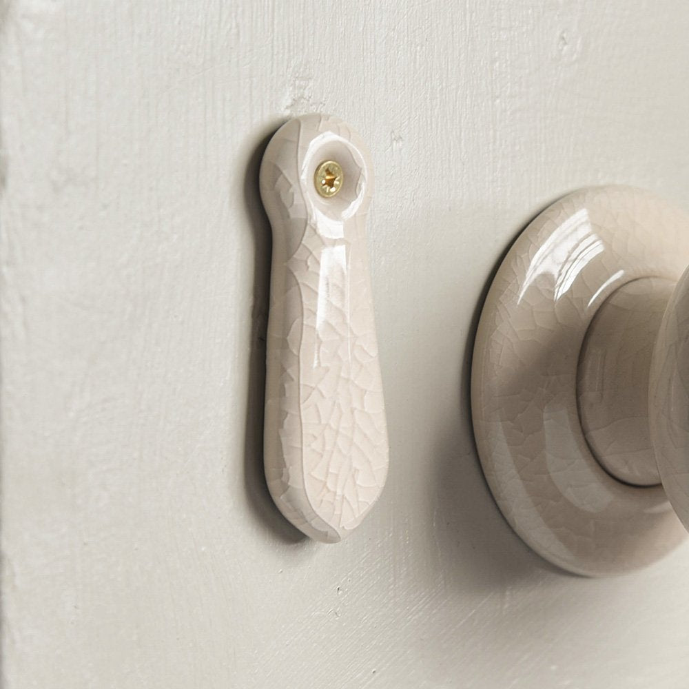 A classic ceramic escutcheon in a crackle glazed finish. These simple Victorian style key hole cover come with a pressed brass backplate and are from the same range as our ceramic door knobs. Ceramic door furniture was popular for almost a century, first appearing around 1830. This style was widely used in Victorian homes upstairs, in servant quarters and in less grand properties due to being more affordable than brass.