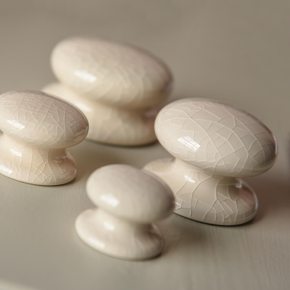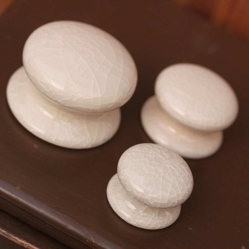 CReam ceramic cabient knobs in four sizes with an aged crackle glazed finish