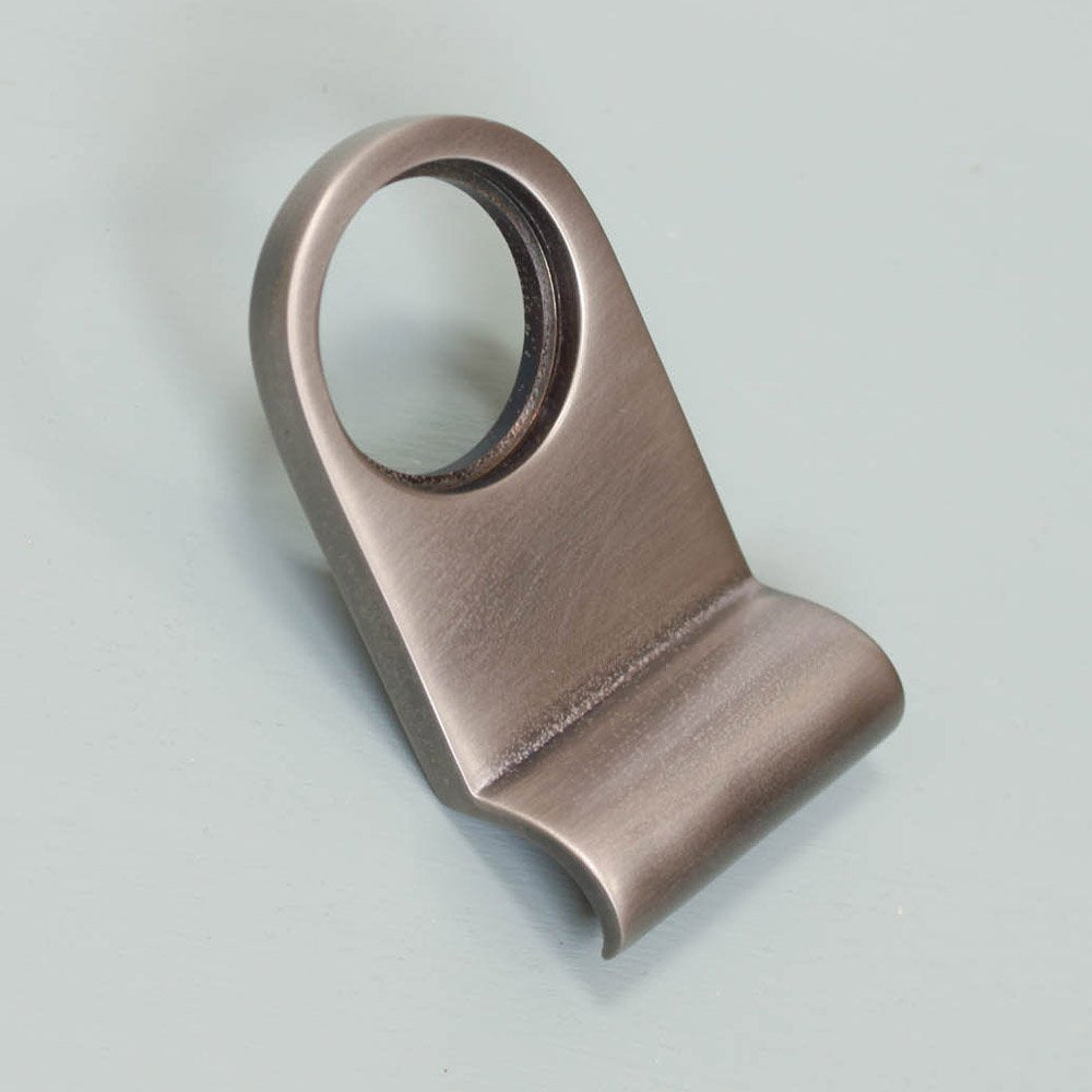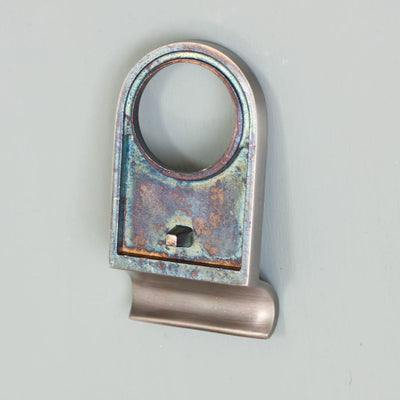 Front door cylinder pull that is designed to sit around a cylinder latch or Yale lock. The pull beneath enables you to pull the door closed behind you. Cast from solid brass and then nickel plated with an aged finish, this simple design is hand made in the UK