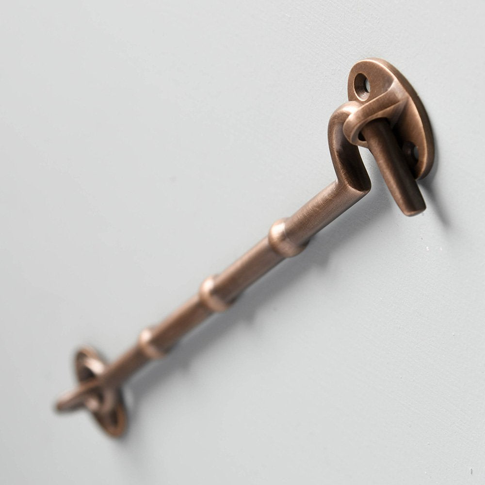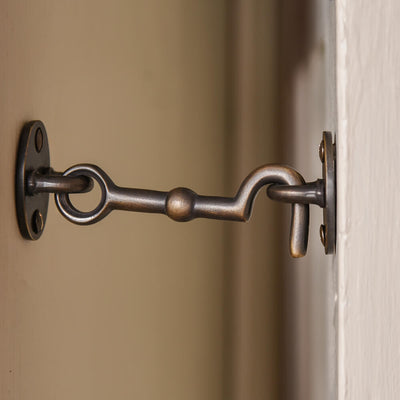 A beautifully finished and versatile cabin hook that can be used for hooking doors, windows or shutters. With elegant detailing this hook is made in the UK from solid brass with a distressed antique finish hand applied.