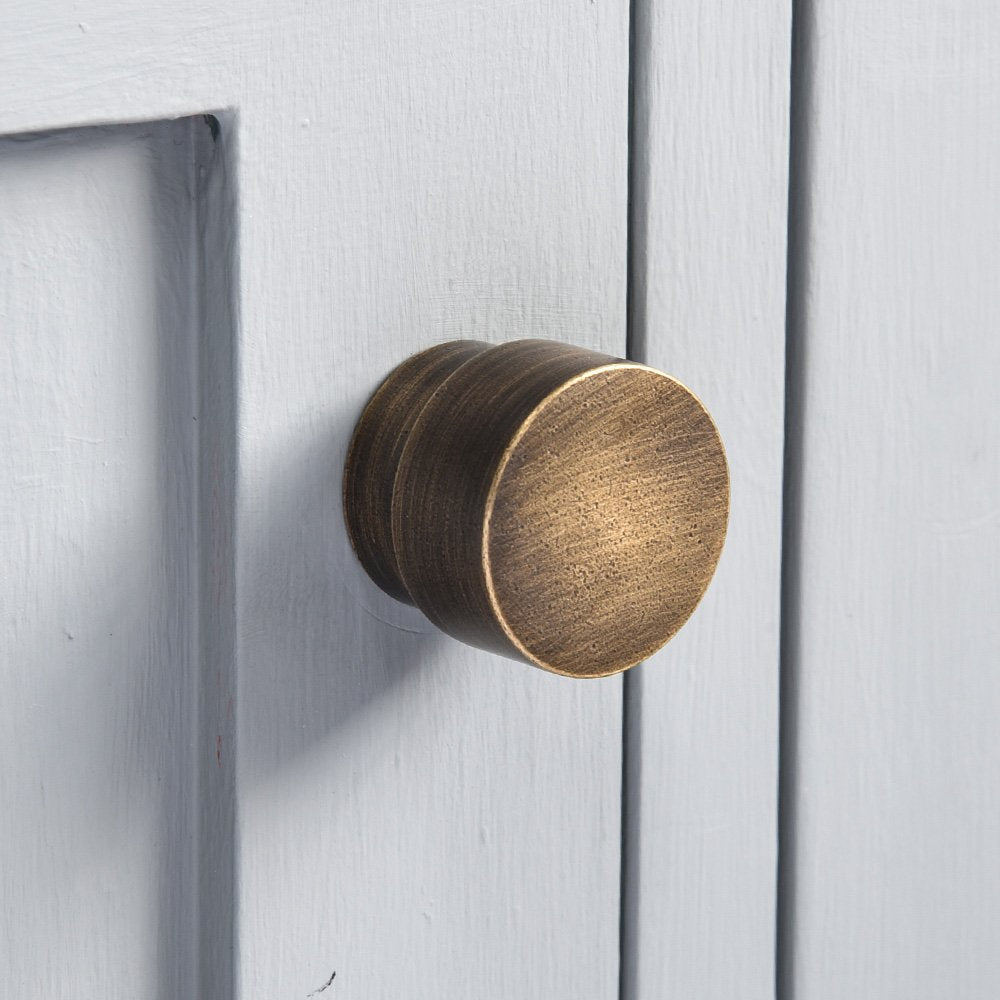 Gorgeous flat round cupboard knob that is crafted from solid brass with a beautiful hand applied distressed antique finish. These cupboard handles are simple in style with a contemporary edge. Extremely weighty and look great used on kitchens, bathroom cabinets and wardrobes.