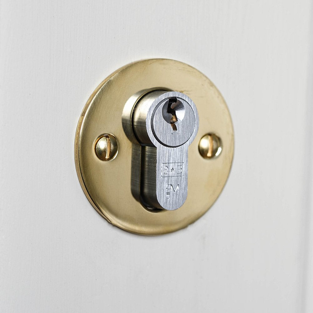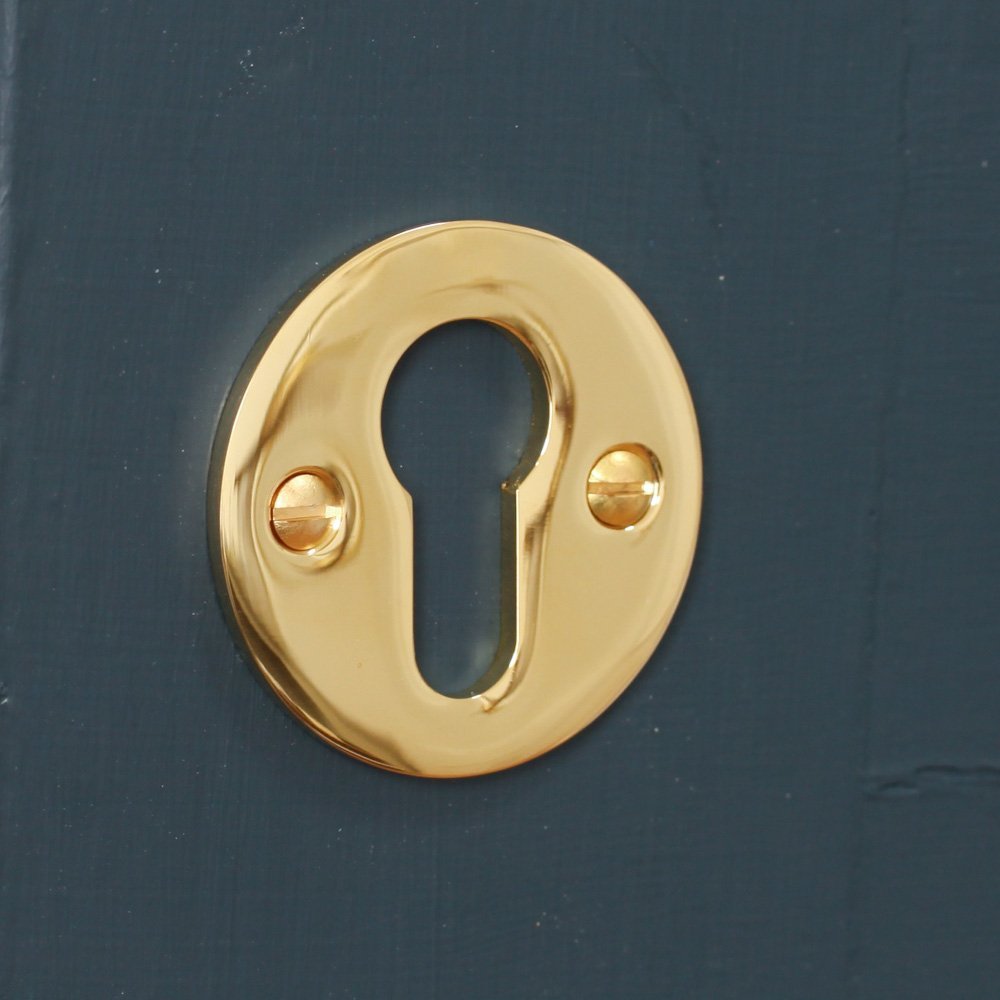 A lovely large round Euro keyhole cover cast in solid brass. A simple design which will work well with our polished brass door knobs. A large keyhole surround to neaten and frame the Euro profile cylinder lock.