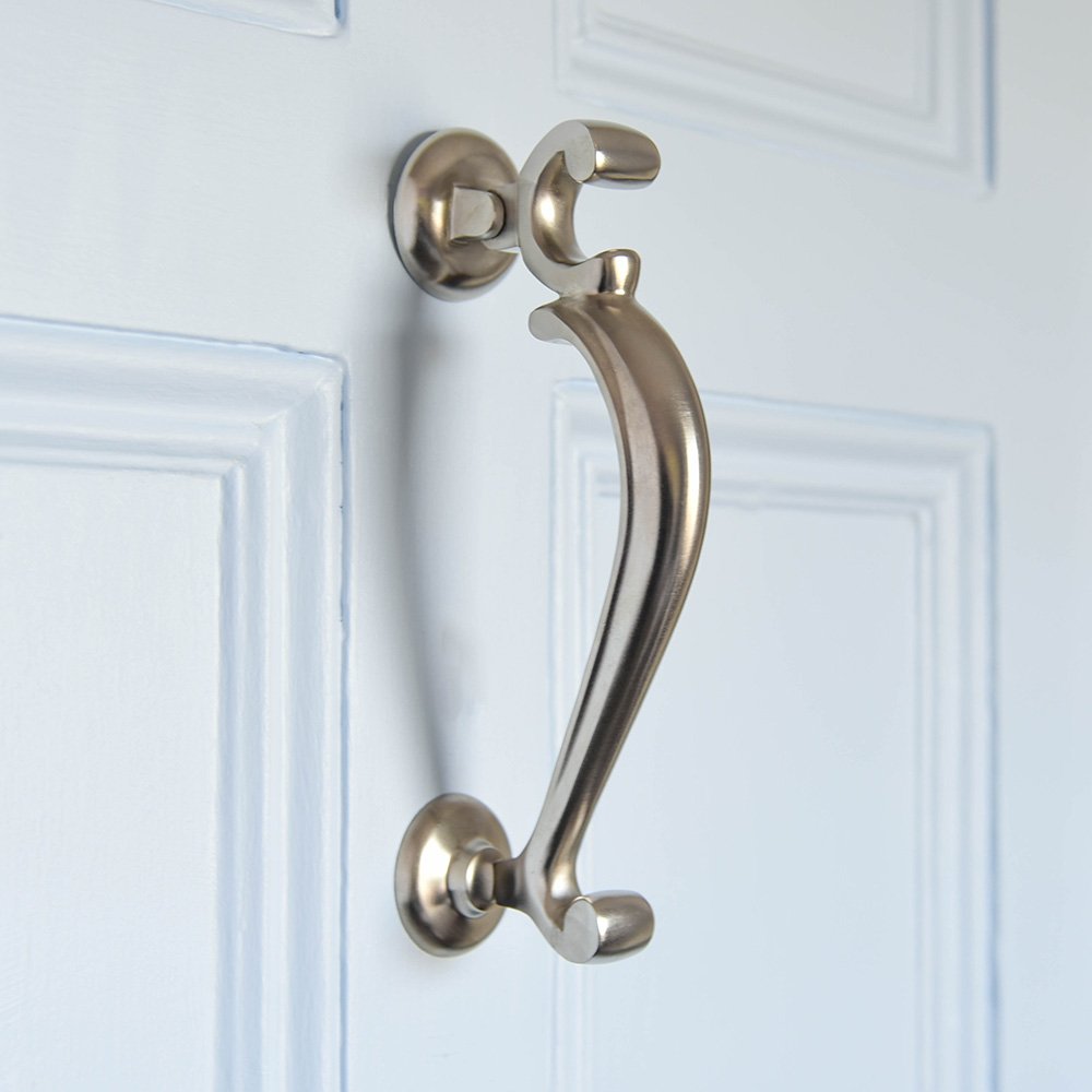 Large doctor's door knocker crafted from solid brass with a satin nickel finish. Perfect for a larger front door. This early Georgian design was named the 'Doctors door knocker' as it was used to identify the front door of the doctor's house. This beautiful replica is popular today due to its slender appearance and subtle detailing.