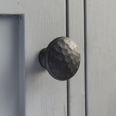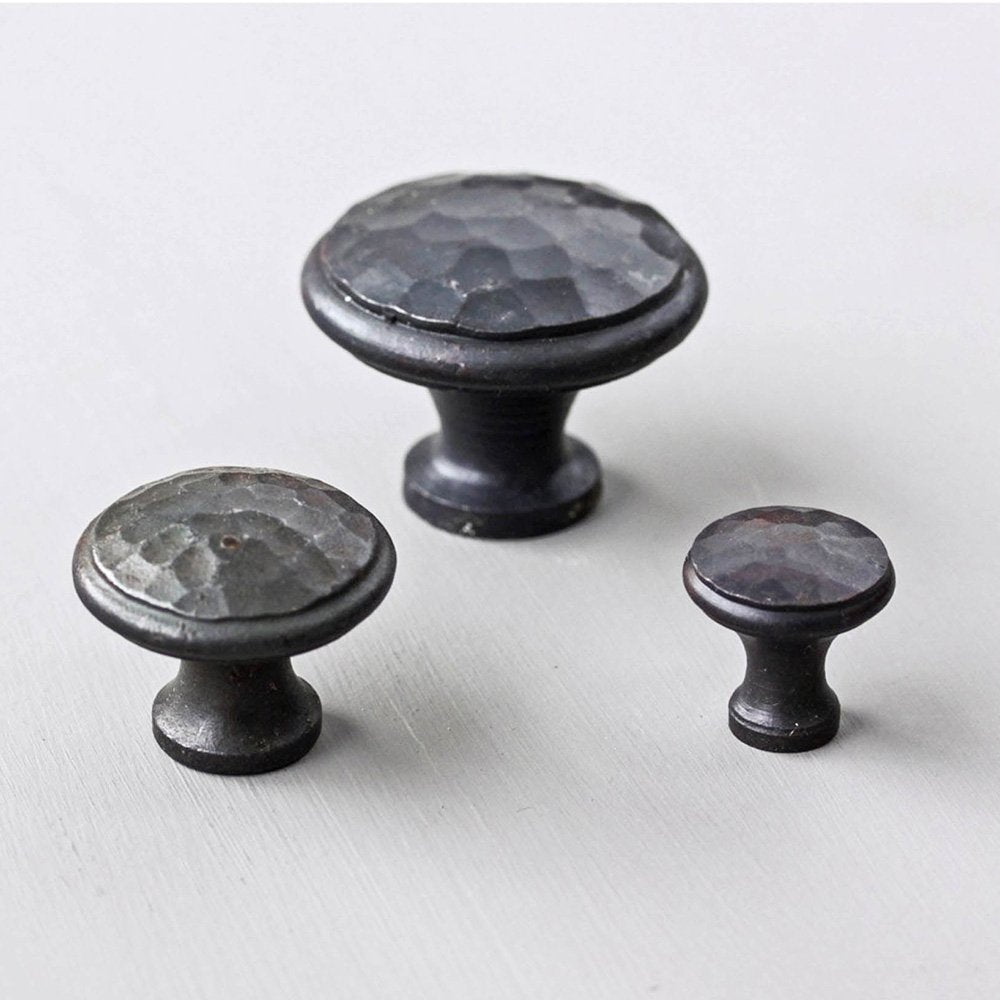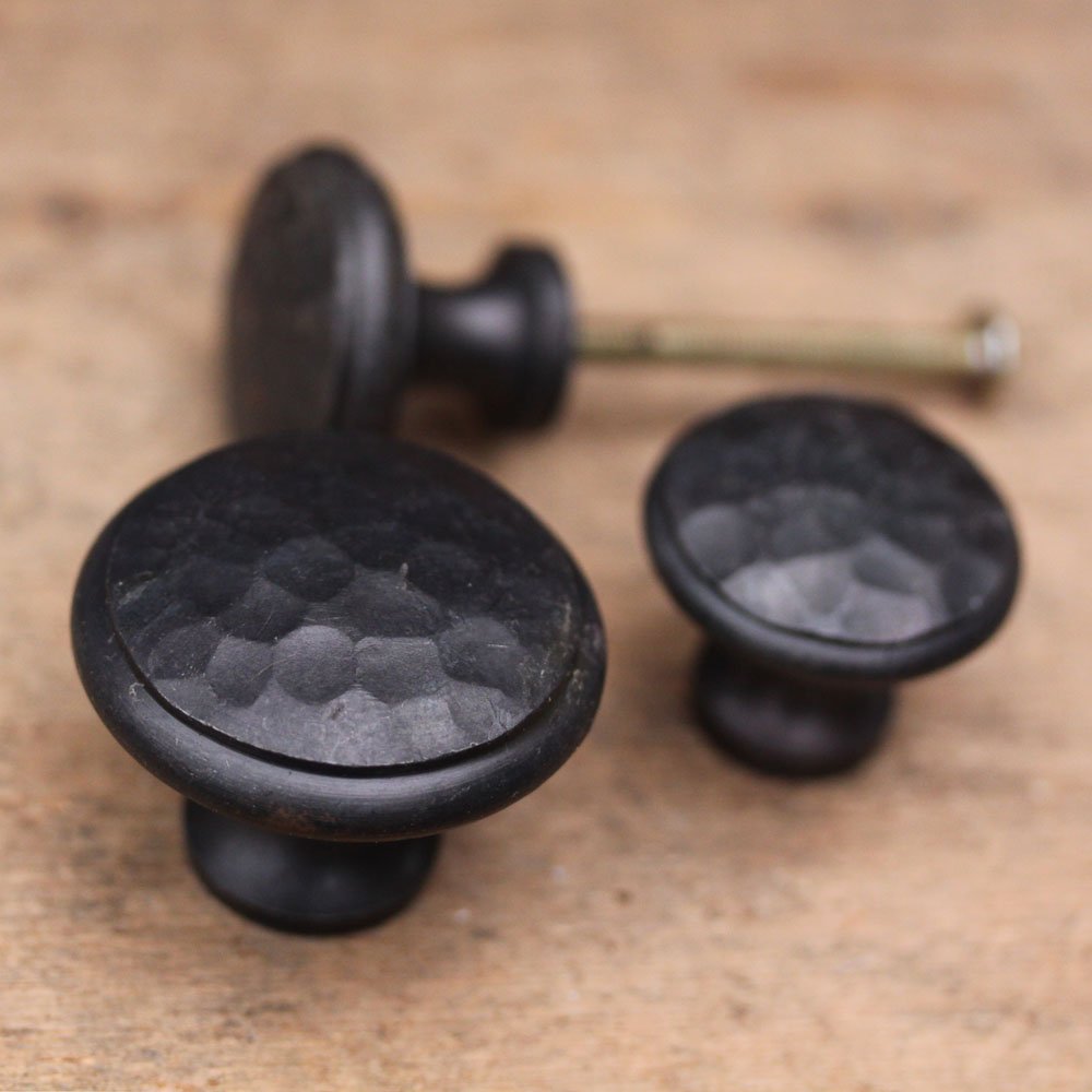 Authentic black cabinet knobs with a hammered surface. They are forged from steel then dipped in hot beeswax to help preserve the metal. Ideal for cupboards, wardrobes or kitchen drawers.
