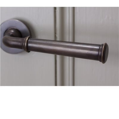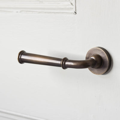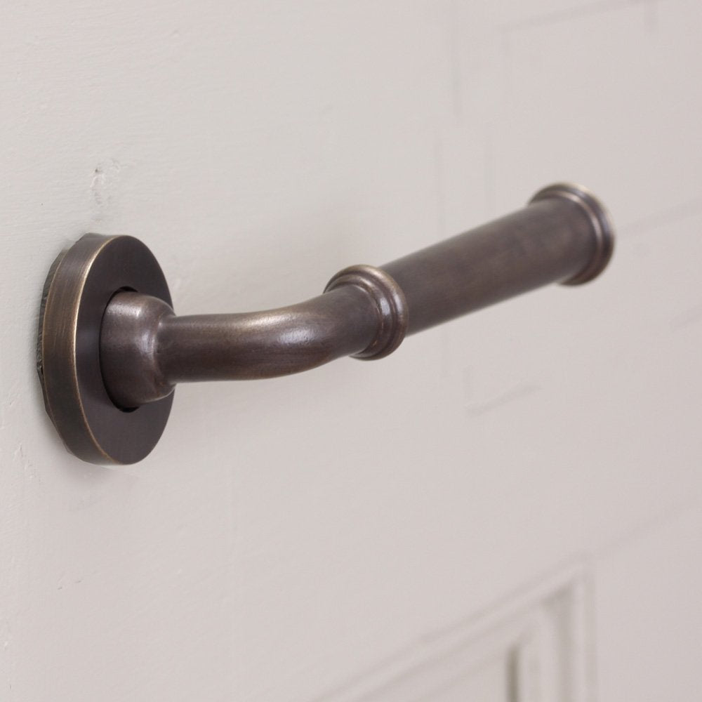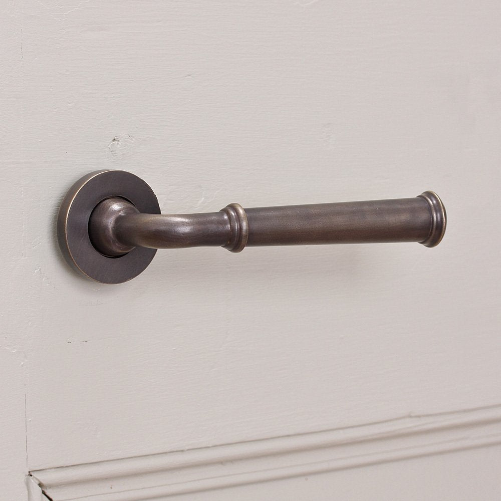 Slender lever door handles with concealed screw backplates. Cast in solid brass with a distressed antique finish. I have these in my own home in this finish and they are incredibly aesthetically appealing and great to use. The handles are unsprung and so require a heavily sprung mortise latch to bring the handle back into position. Hand made in the UK they are superbly made and finished.