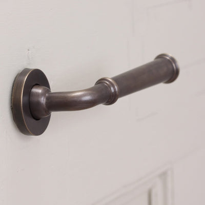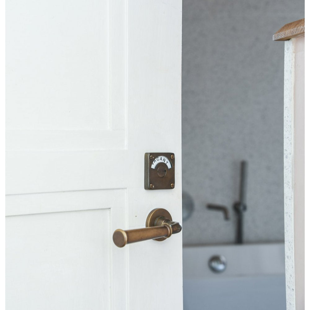 Distressed antique brass Grace Lever Handles paired with our Vacant/Engaged Lock on bathroom door.