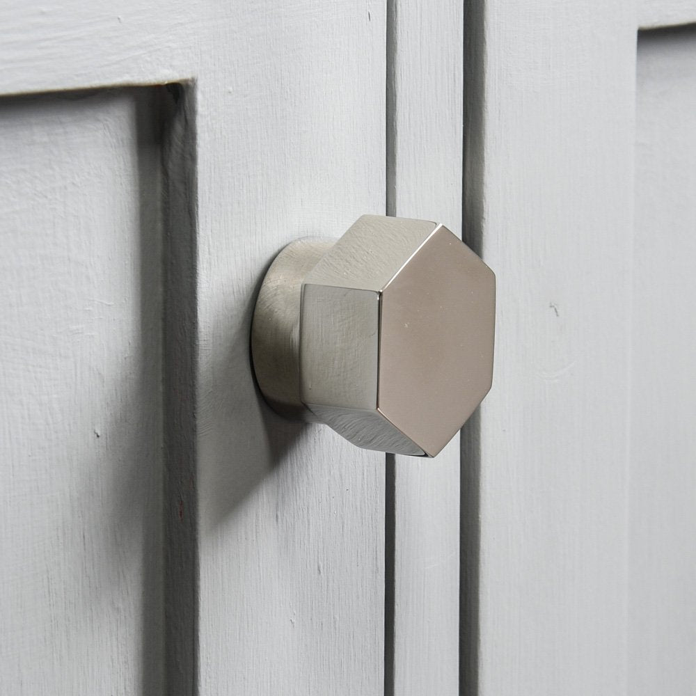 Superb quality hexagon cupboard handle that adds a contemporary feel to a traditional period home. Ideal for kitchens and wardrobes and would look lovely teamed with the hex bar pull handles from the same range. Extremely weighty and crafted from solid unlacquered brass with a polished nickel finish.