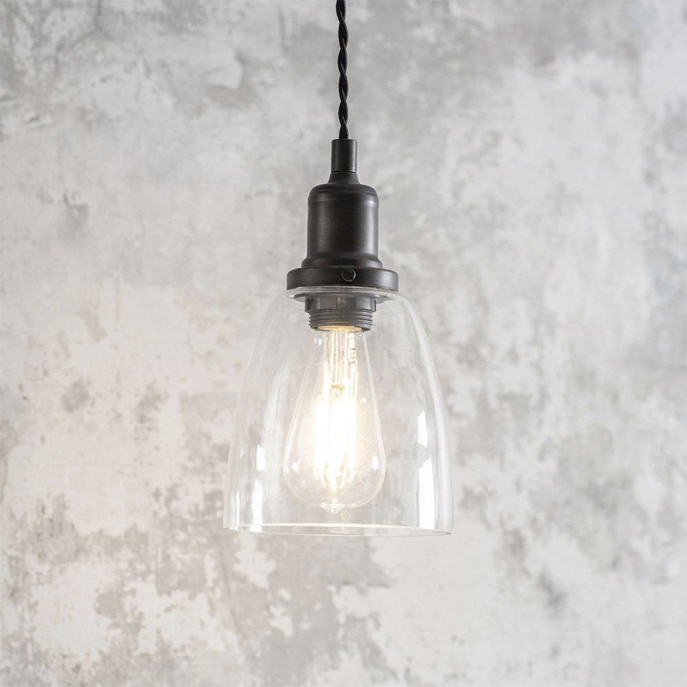 Stunning glass pendant with antique bronze fittings and black twisted cable. A great size for a hallway, bedside light or would look amazing in a row or group gathered over the kitchen island unit or dinning table. Why not team it with a filament bulb to complete the look.