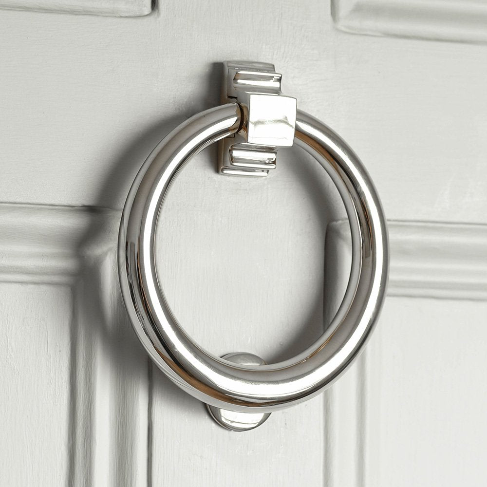 High quality ring door knocker in a larger size that is ideal for larger doors and would make a lovely statement piece. Hand crafted in a UK foundry and is stunning quality and weight. Crafted from solid brass with a polished nickel plated finish.