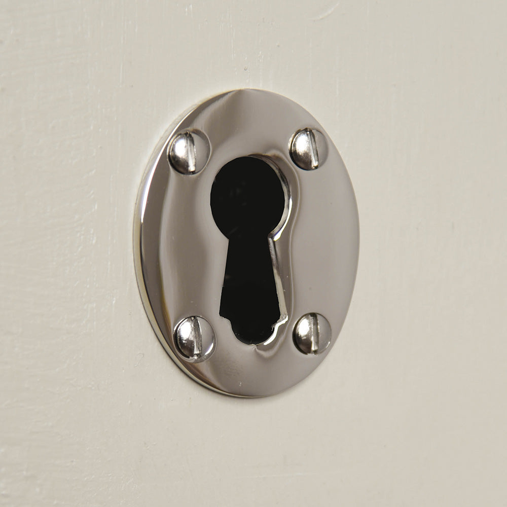 Lovely keyhole escutcheon in a large oval design that is cast from solid brass with a polished nickel plated finish. Perfect for front doors and locks where large keys are used and often bought to suit the other side of the door to a rim lock. UK made.