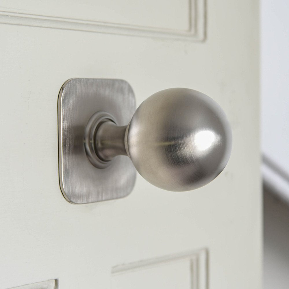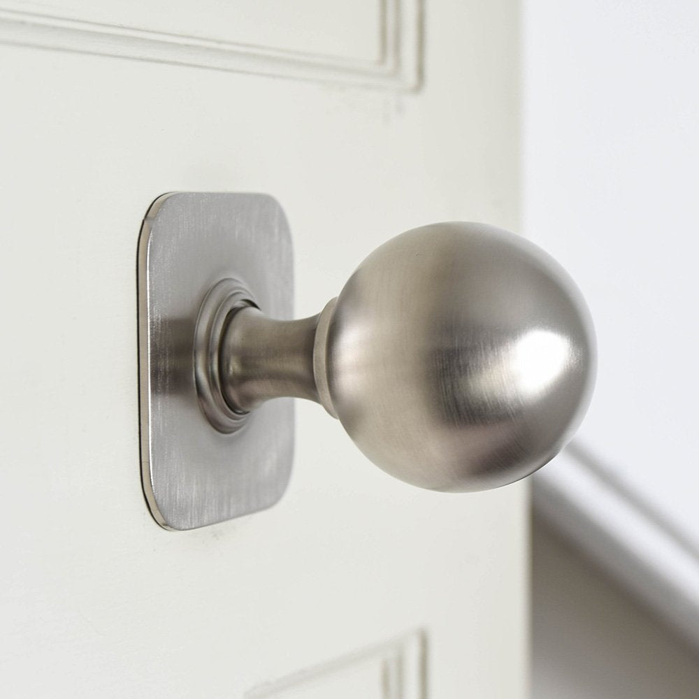 Large round central door pull that is cast from solid brass and plated in a brushed nickel. Hand crafted in the UK using traditional techniques. This door pull is particularly weighty and tactile and is fixed using a large threaded bolt that passes through the door.