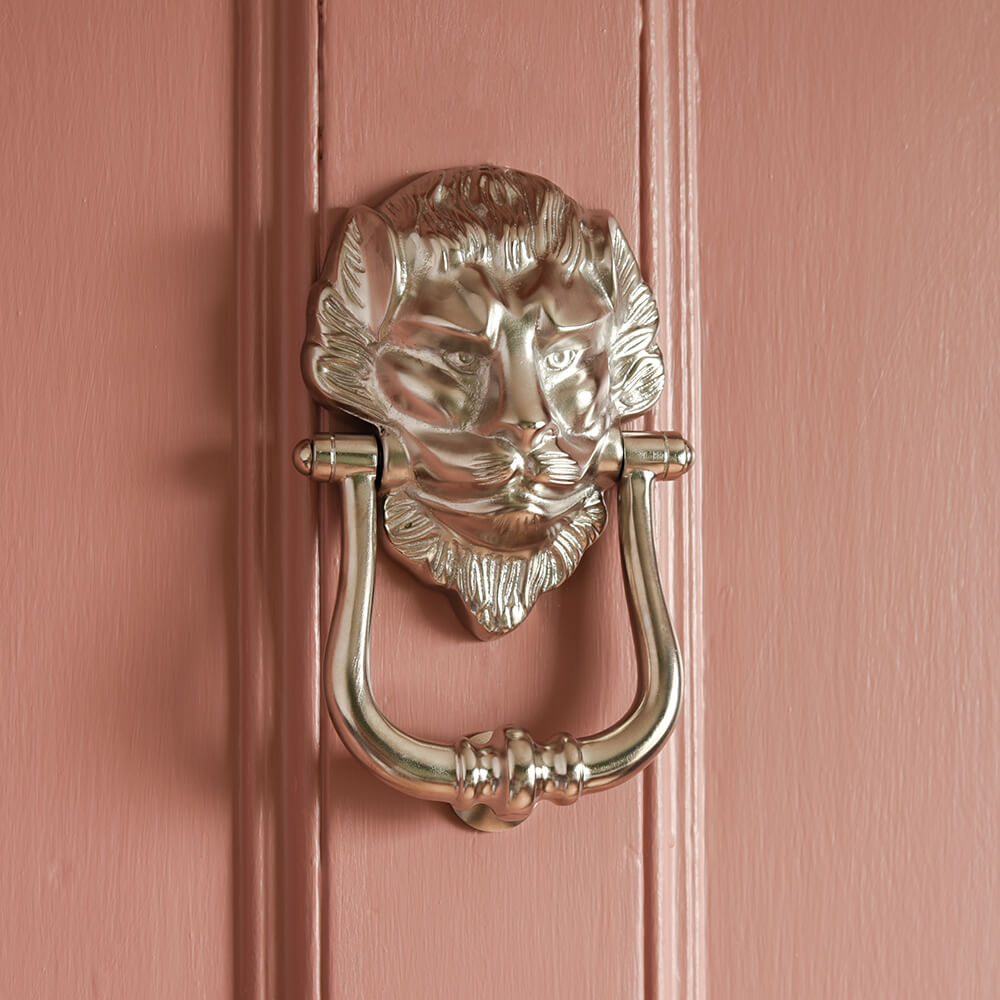 Large door knocker in a traditional Lion head design. Crafted from solid brass with a satin nickel plated finish. This weighty and substantial door knocker will add grandeur to any entrance and this Regency style has remained popular for over a Century. Superb quality hand crafted in a UK foundry. The satin silver appearance offers a more contemporary twist.