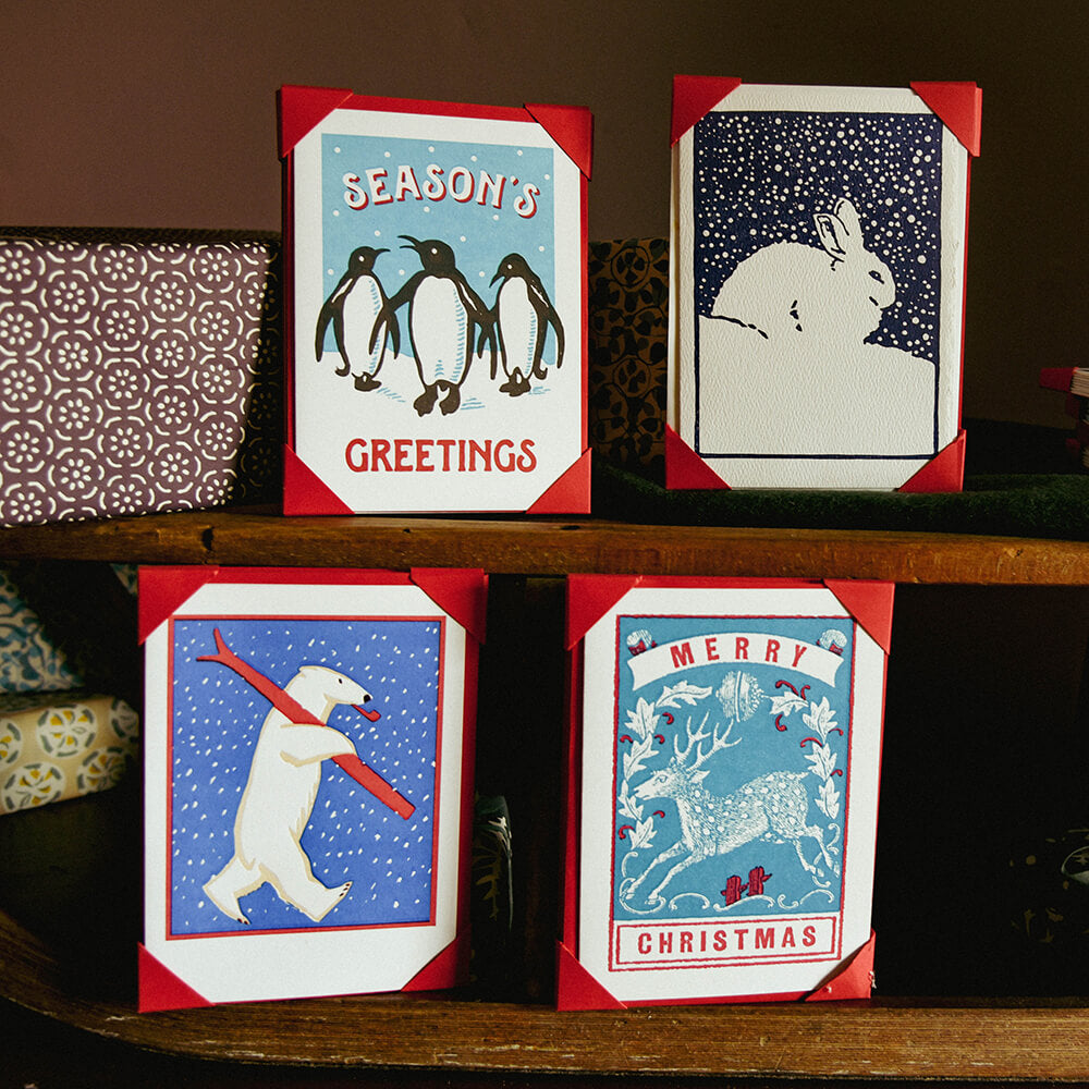 These lovely letterpress christmas cards each feature a winter scene and come as a pack of 5. Blank inside for your own message, each set includes the same design. Designed and printed in the UK with 4 different designs to choose from.