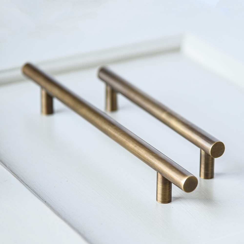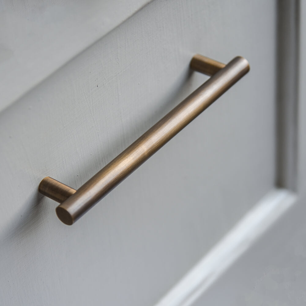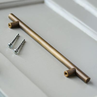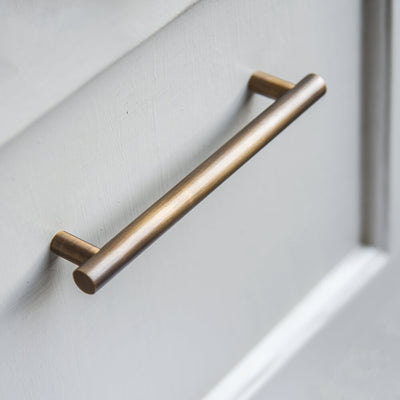 Simple solid brass bar pull handle that can be used horizontally or vertically and is ideal for cabinets and drawers and integrated appliances. Made in a UK foundry using traditional techniques with an antique 'living' finish that is hand applied.