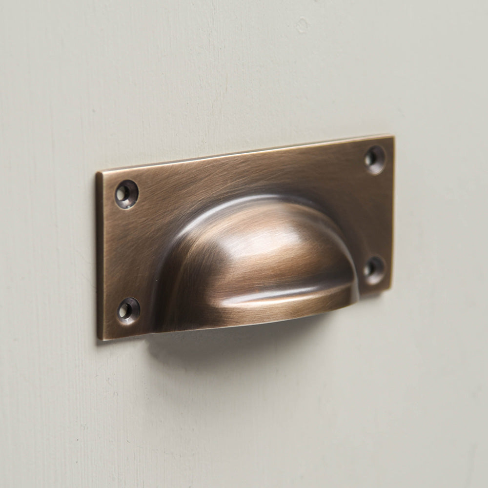 This hooded drawer pull feels weighty and substantial and would be great for kitchen drawers. The cup style handle has a rectangular backplate and works beautifully with many cabinet knobs and fittings from the same range. Crafted from solid brass with a light antique finish hand applied. This subtle aged feel gives a softer appearance to the brass and will continue to aged gaining a lovely natural patina over time.