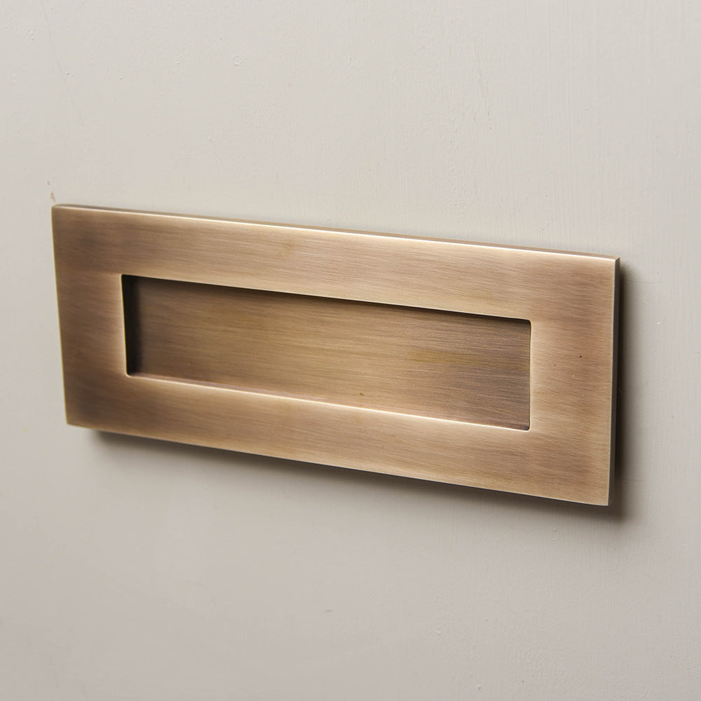 Handcrafted in the UK this high quality solid brass letterplate has been applied with a light antique finish giving it a subtle aged appearance. This beautiful antique finish is known as a living finish, normal wear and handling will allow the raised areas to reveal the metal below giving an authentic appearance. Hand applied each piece may slightly vary in tone giving a lovely natural patina.