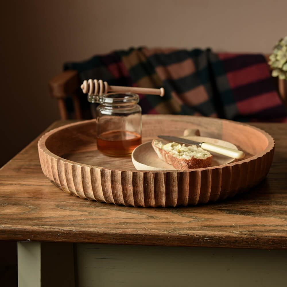 Beautiful wooden serving bowl that is crafted from sustainable mango wood using traditional techniques with hand etched detailing around the outer edge. The shallow sides make it perfect for serving breads, cheeses or even fruit.