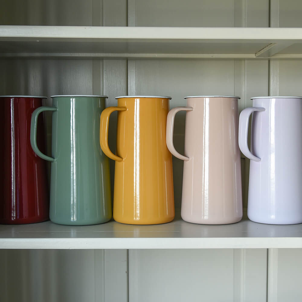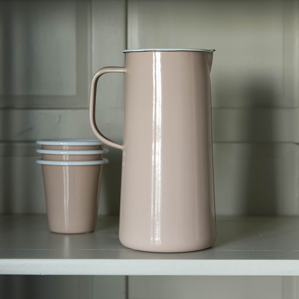 Traditional enamel pitcher that holds up to 3 pints and is finished in a lovely soft pink with a white interior. Matching tumblers are also available.